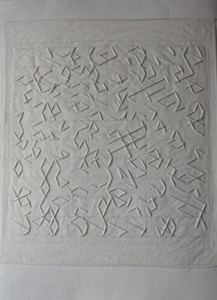 86 lignes parallèles de la polygraphie sauf une, la 87e ligne, le clinamen en cordeau blanc. Un oulipien m’avait précisé que La Tour a pour valeur numérale 87. Le clinamen représente, entre autres, la Bibliothèque de Babel de Borges, et c’est dans cette zone que je trouverai par la suite le W de Joyce annoncé par Jacques Lederer