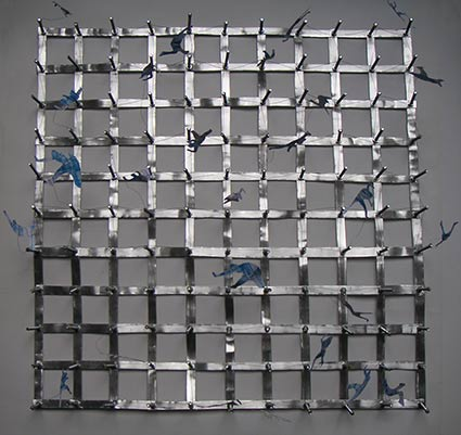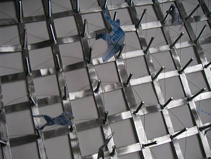 Les tenségrités sont des répartitions à l’équilibre de contraintes structurales, ce qui nécessite une tension commune pour que la géométrie tienne et résiste à sa forme, ci-dessous la structure passive-active de ma maquette en acier réalisée en 2006 se stabilise par les fils solidaires, conducteurs, alternatifs et tendus en laiton fin qui apportent une résistance formelle 11 au carré = 121 le palindrome aux 2 lectures possibles de gauche à droite et de droite à gauche de l’histoire