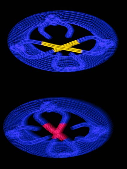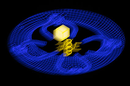 Les tenségrités sont des répartitions à l’équilibre de contraintes structurales, ce qui nécessite une tension commune pour que la géométrie tienne et résiste à sa forme, ci-dessous la structure passive-active de ma maquette en acier réalisée en 2006 se stabilise par les fils solidaires, conducteurs, alternatifs et tendus en laiton fin qui apportent une résistance formelle 11 au carré = 121 le palindrome aux 2 lectures possibles de gauche à droite et de droite à gauche de l’histoire